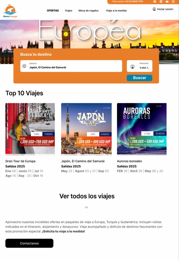 Plataforma completa de viajes con sistema de reservas, gestión de itinerarios y pagos integrados. Una experiencia de usuario fluida para planificar el viaje perfecto.